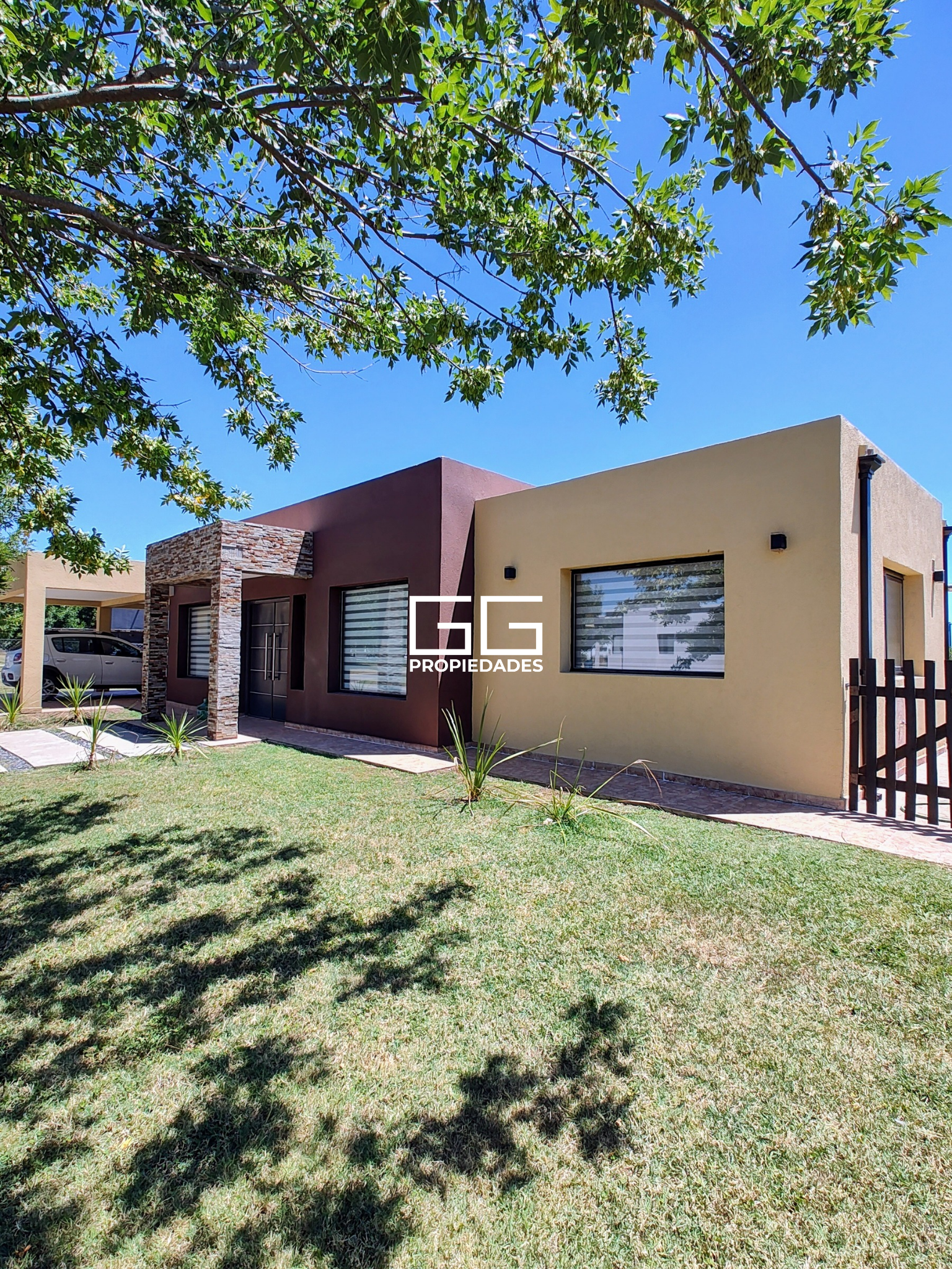 Frente de la propiedad con jardín, hall externo de recepción, cochera techada para dos vehículos y espacio libre para otros.