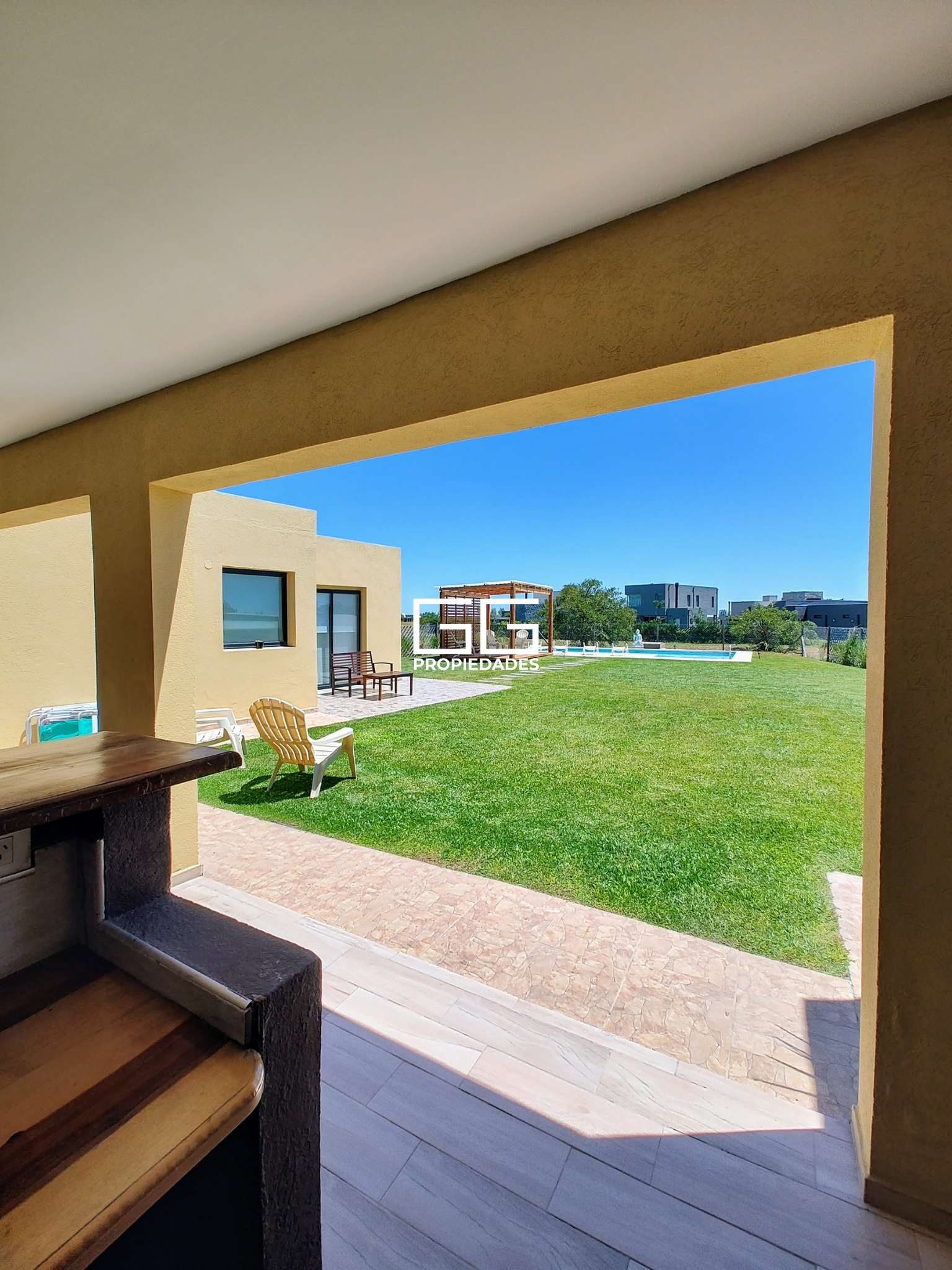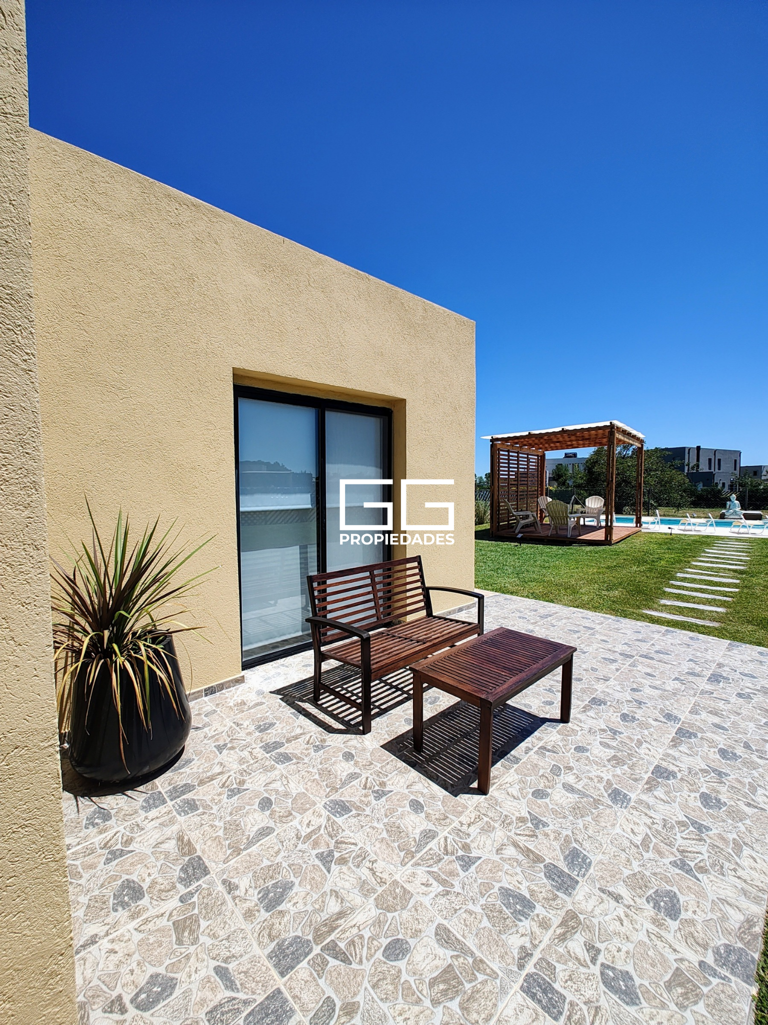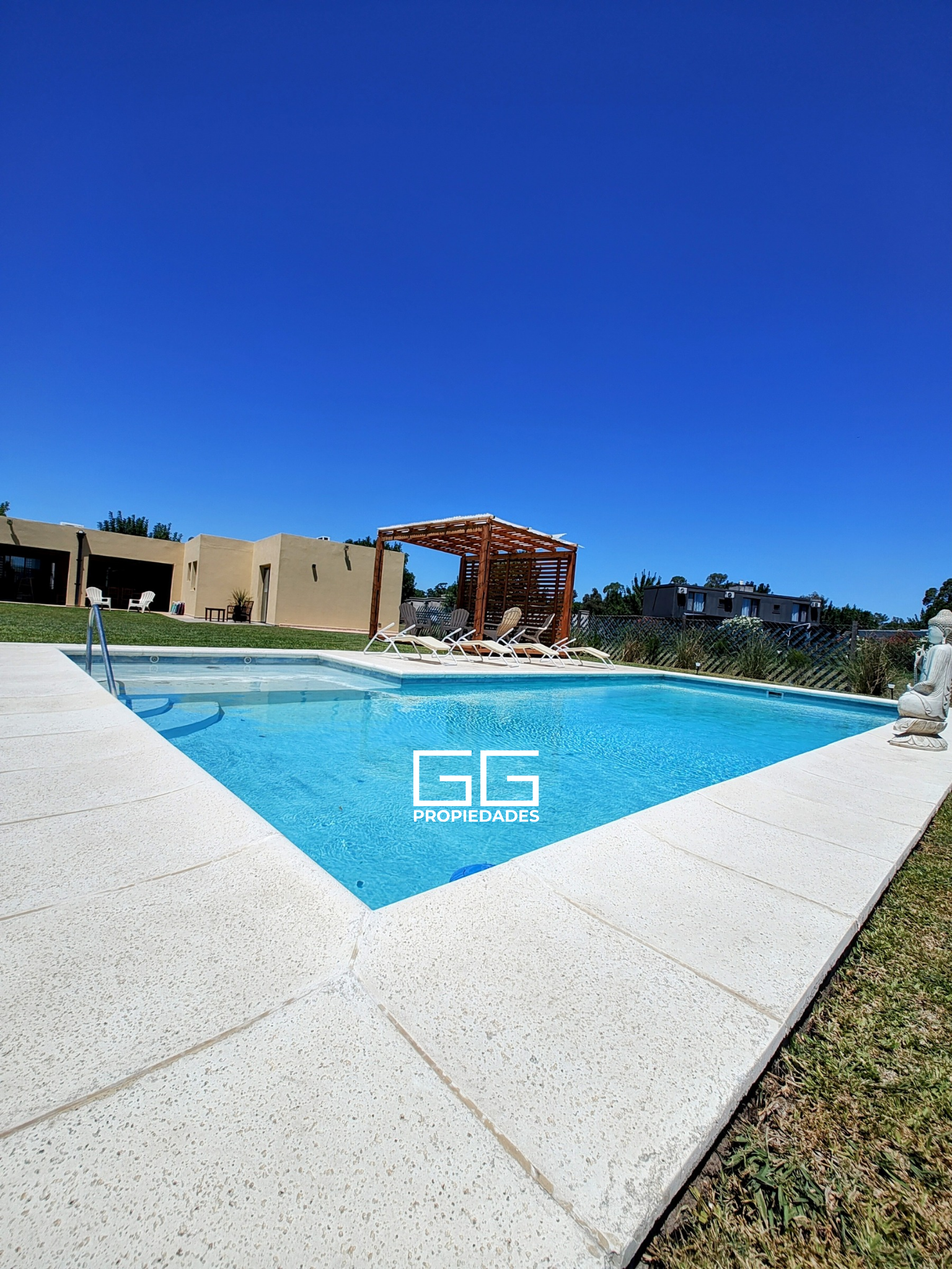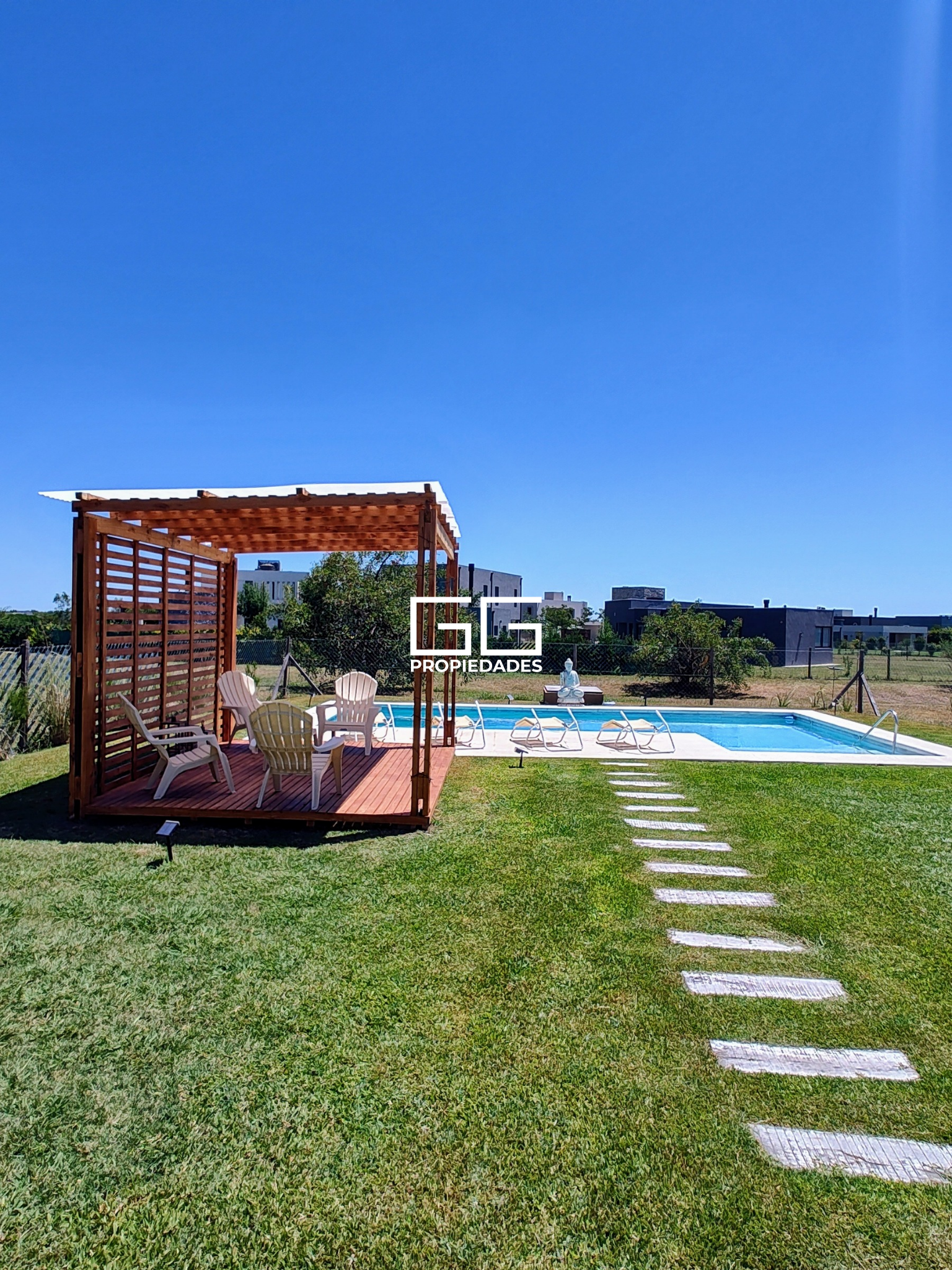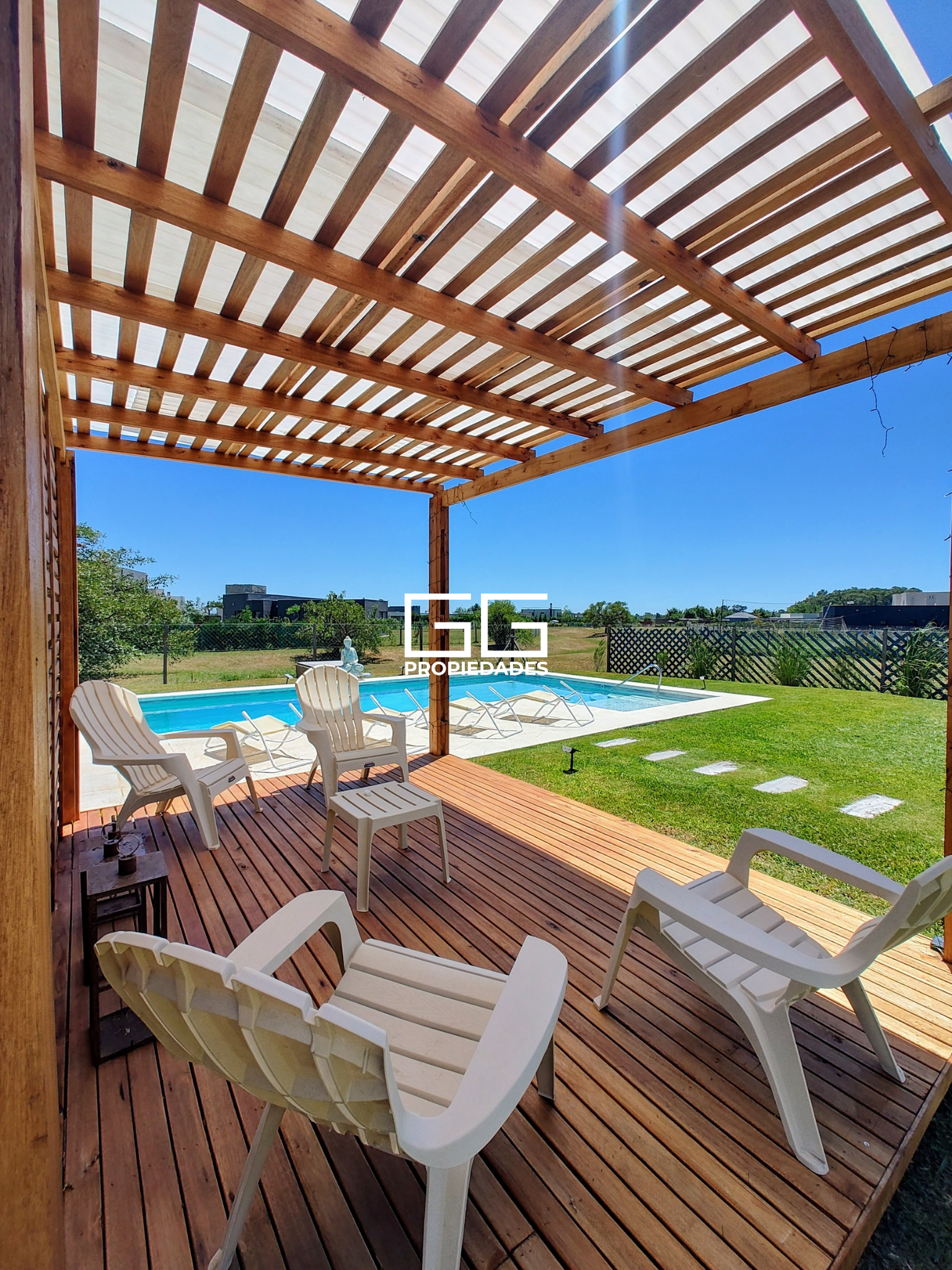 Jardín con pérgola y una gran piscina de 11×4 más playa húmeda de 2×2.
