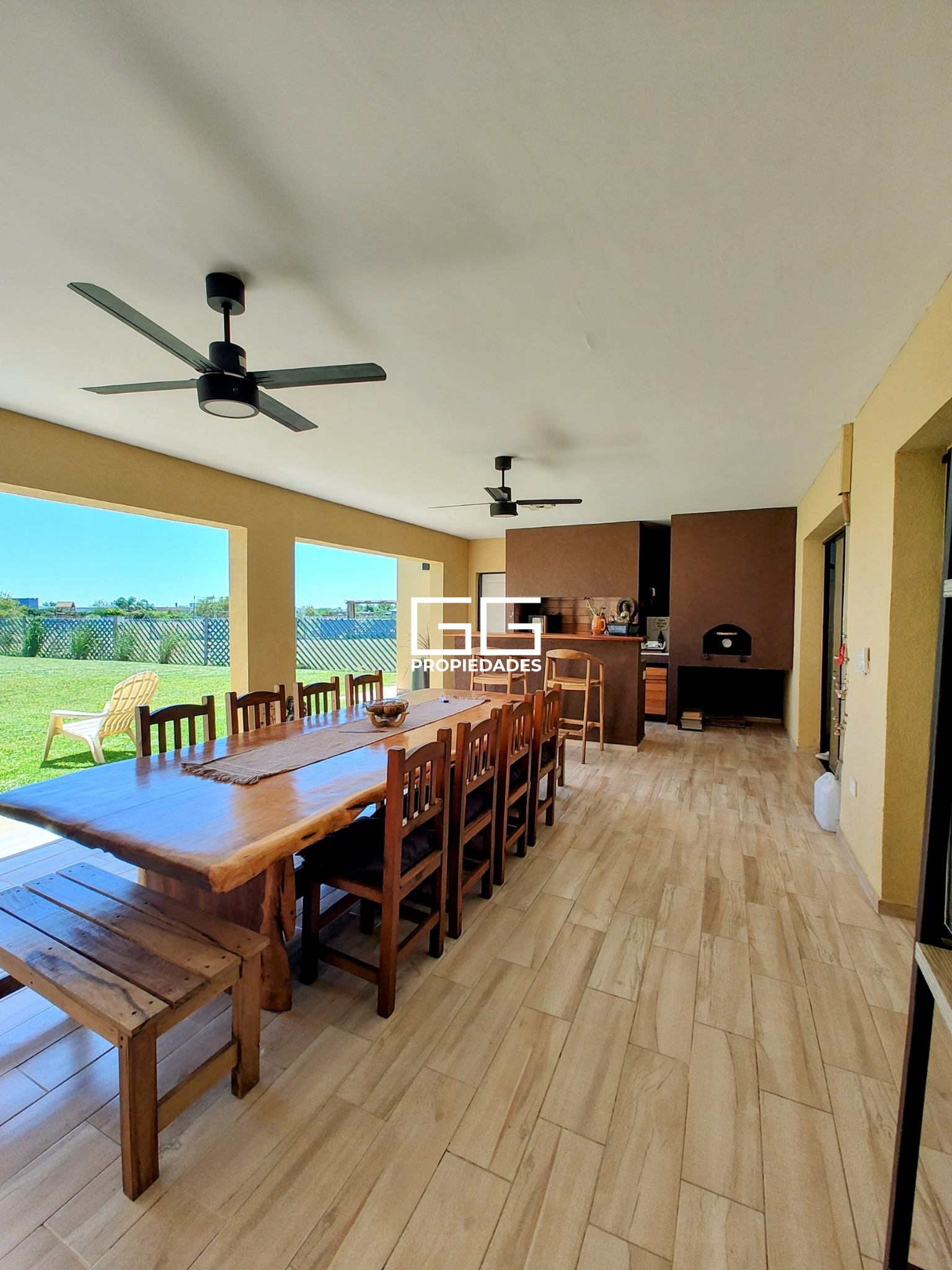 Galería con parrilla, barra con bacha, horno de barro y baño completo.